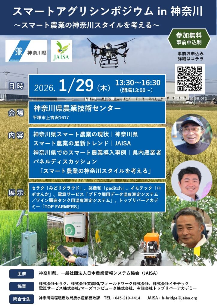 神奈川県、日本農業情報システム協会が主催する「スマートアグリシンポジウム」が、2026年1月29日(木)に神奈川県平塚市で開催されます。
