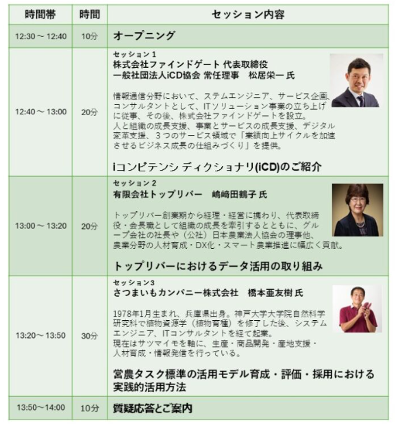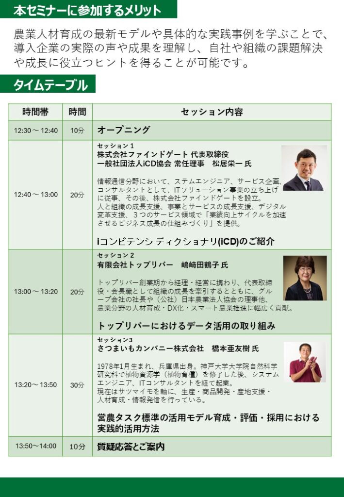 農業分野における最新の人材育成モデルや、現場で役立つ実践的な農業版iCD(iコンピテンシディクショナリ)を活用した人材育成、評価、採用の仕組みを紹介します。具体的な導入事例を通じて、農業現場の課題解決や組織力の強化に役立つ知見をお伝えします。